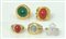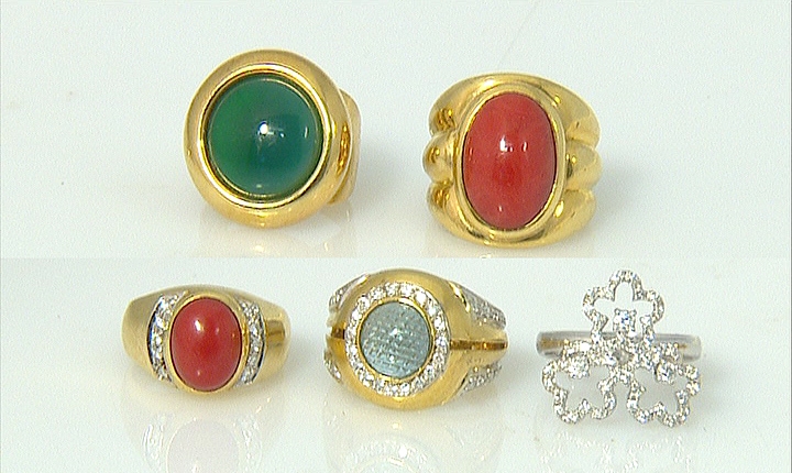 LOTTO DI CINQUE ANELLI. In oro giallo e bianco 18 kt di varie forme e raffigurazioni trattenenti gemme taglio cabochon (corallo, prob. topazio e pasta vitrea), diamanti taglio brillante per tot. cts. 1,00 ca.