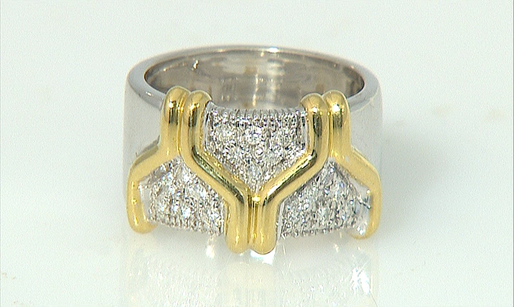 ANELLO. In oro bianco e giallo 18 kt a fascia con motivi geometrici alternati a settori in diamanti taglio brillante per tot. cts. 0,20 ca.
