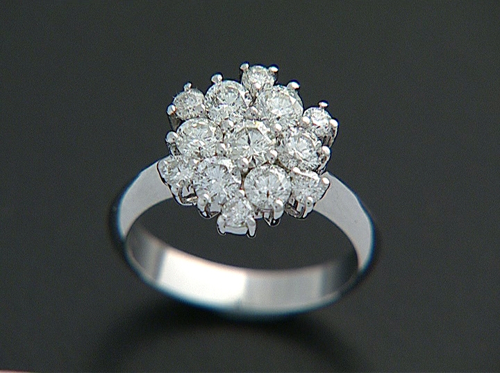 ANELLO. In oro bianco 18 kt a fiore con diamanti taglio brillante per tot. cts. 2,00 ca.