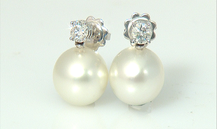 COPPIA DI ORECCHINI. In oro bianco 18 kt perno e farfalla con due diamanti taglio brillante per tot. cts. 0,60 ca. e perle South Sea di mm 12 ca. imperniate nella parte terminale.