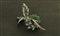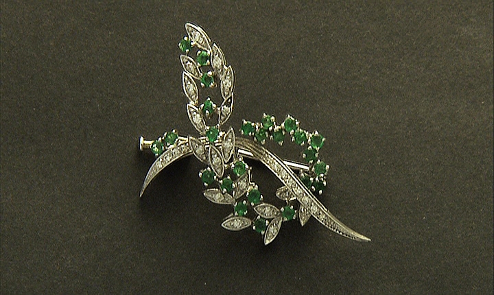 SPILLA ANNI '60 CA. In oro bianco 18 kt di gusto floreale con decori in diamanti taglio huit-huit per tot. cts. 0,50 ca. e smeraldi taglio rotondo per tot. cts. 1,10 ca., chiusura ad ago semplice.
