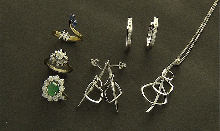 LOTTO DI CINQUE GIOIELLI. In oro bianco e giallo 18 kt composto da tre anelli, coppia di orecchini a cerchio ed una demi parure (ciondolo e coppia di orecchini perno e farfalla), diamanti taglio brillante, huit-huit e vecchio per tot. cts 2,00 ca., smeraldo taglio rettangolare a contorno ottagonale di cts. 0,80 ca. e zaffiri taglio rettangolare per tot. cts. 0,20 ca.