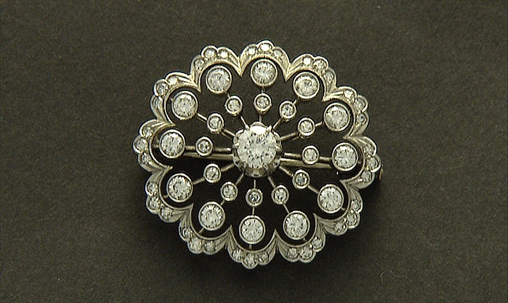 SPILLA ANNI '60 CA. In oro bianco 18 kt montatura a raggiera centrata da diamante taglio brillante di cts. 0,45 ca. (prob. colore G purezza VVS); diamanti taglio huit-huit e brillante per tot. cts. 2,00 ca. a decoro, chiusura ad ago semplice.