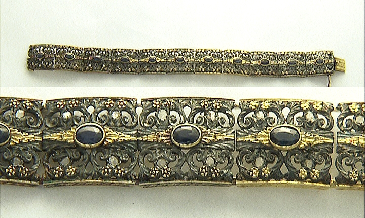 BRACCIALE XIX SECOLO. In oro giallo ed argento a maglie rettangolari traforate con incisioni floreali, zaffiri taglio ovale per tot. cts. 3,50 ca. e diamanti taglio rosa a decoro.