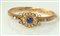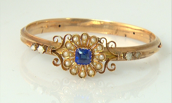 BRACCIALE INIZIO XX SECOLO. In oro bassa caratura, rigido realizzato a cannavuota sezione piatta con motivo a fiore entro decori a volute, al centro gemma blu sintetica (ad imitazione dello zaffiro) entro decori in piccole perle.