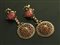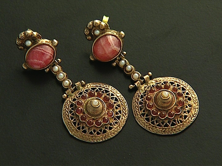 COPPIA DI ORECCHINI PENDENTI. In argento d'orato ed oro giallo 18 kt perno e farfalla realizzati a doppio corpo con gemme rosa taglio cabochon e microperle.