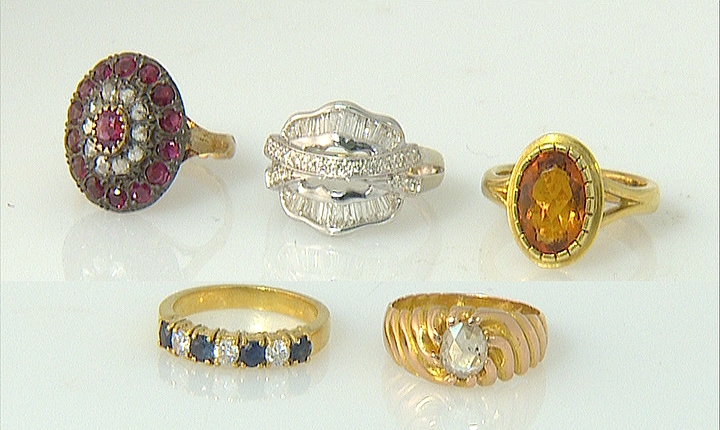 LOTTO DI CINQUE ANELLI. In oro giallo e bianco 18 kt ed argento con zaffiri taglio rotondo per tot. cts. 0,50 ca., rubini taglio rotondo per tot. cts. 1,50 ca., diamanti taglio rosa, gemma arancione taglio ovale (prob. quarzo) e diamanti taglio brillante e baguette per tot. cts. 0,90 ca.