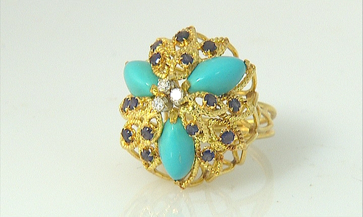 ANELLO. In oro giallo 18 kt montatura bombata realizzata in filo ritorto e liscio con decori in turchese taglio marquise cabochon, zaffiri taglio rotondo per tot. cts. 0,90 ca. e diamanti taglio huit-huit per tot. cts. 0,15 ca.