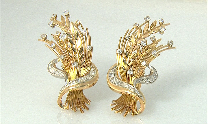COPPIA DI ORECCHINI. In oro giallo e bianco 18 kt a ramages nastrati, filo d'oro e diamanti taglio huit-huit e brillante per tot. cts. 0,70 ca.