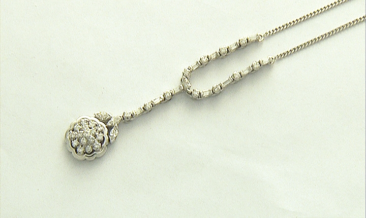 COLLANA. In oro bianco 18 kt maglia groumette con settore centrale di gusto floreale in diamanti taglio brillante, baguette e navette per tot. cts. 1,50 ca.