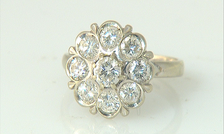 ANELLO. In oro bianco 18 kt a fiore con diamanti taglio brillante per tot. cts. 1,40 ca.