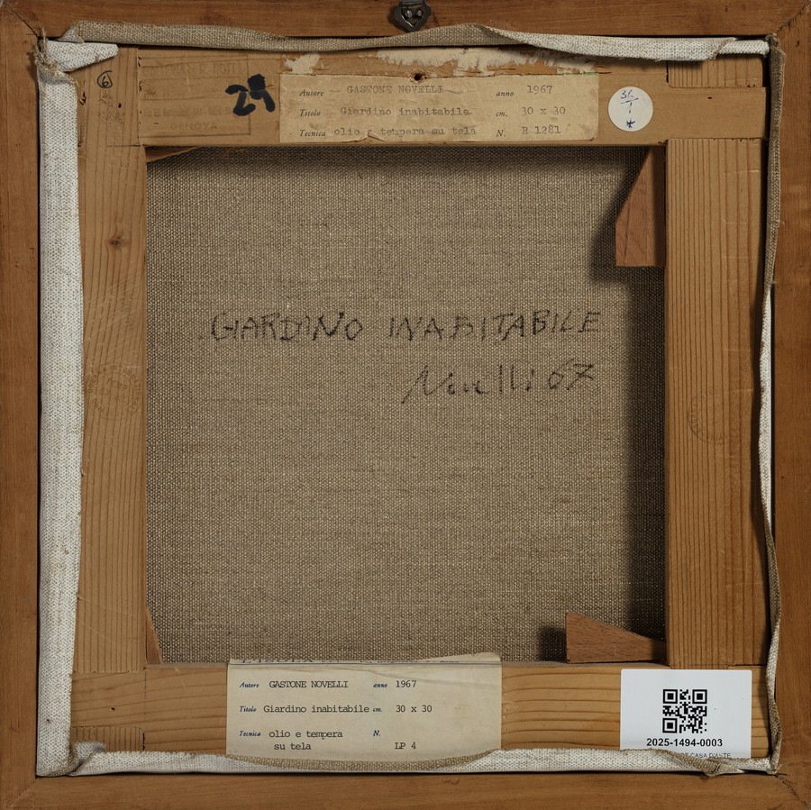 NOVELLI GASTONE (1925 - 1968) GIARDINO INABITABILE. 1967. olio, tempera e matita su tela. Cm 30,00 x 30,00. sul retro: firma, data, titolo, etichetta Galleria L'isola, Roma e timbro Galleria Rotta, Genova