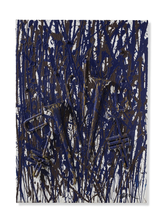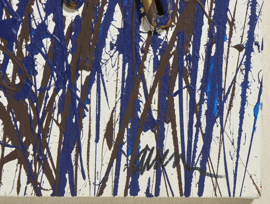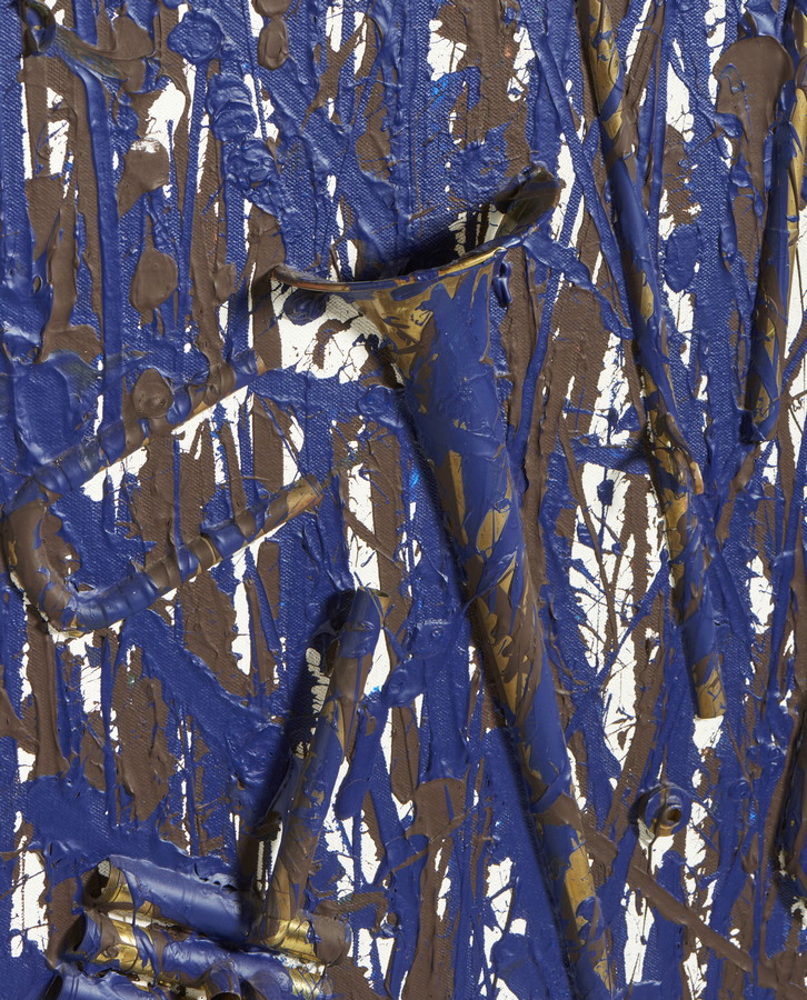 ARMAN FERNANDEZ (1928 - 2005) SENZA TITOLO. 1999. Trombone tagliato con vernice acrilica marrone scuro e blu di Prussia su tela. Cm 73,50 x 102,00. firma