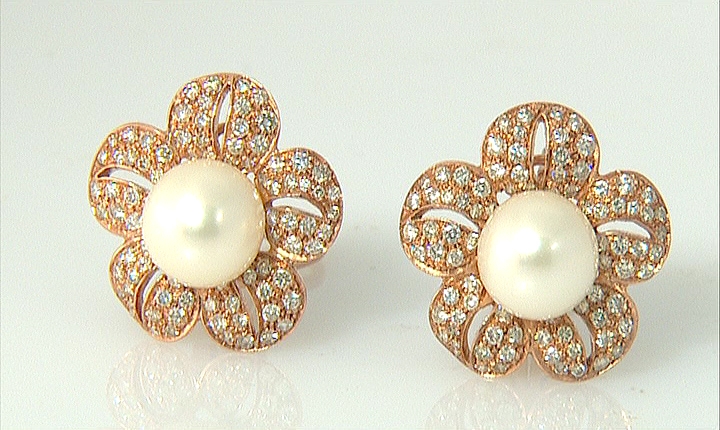 COPPIA DI ORECCHINI. In oro rosa 18 kt, perno e clip, montatura a fiore con perle South Sea di mm 11 ca. disposte al centro entro petali in diamanti taglio brillante per tot. cts. 3,40 ca.