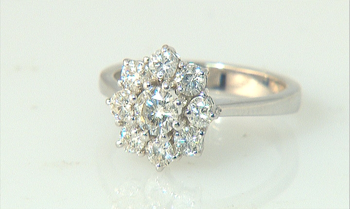 ANELLO. In oro bianco 18 kt sommità a fiore con diamante taglio brillante di cts. 0,35 ca. entro cornice in diamanti taglio brillante per tot. cts. 0,80 ca.
