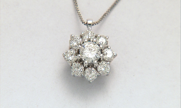 CIONDOLO. In oro bianco 18 kt con diamante taglio brillante di cts. 0,35 ca. entro contorno in diamanti taglio brillante per tot. cts. 0,80 ca., trattenuto da fine catenina in oro bianco 18 kt.