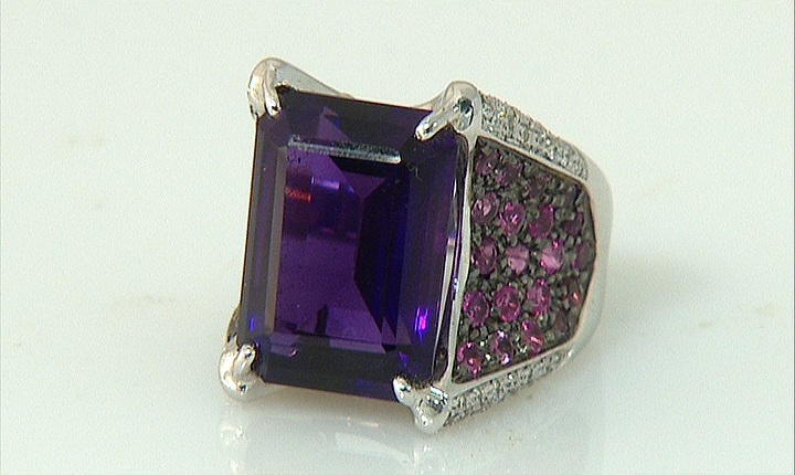 ANELLO. In oro bianco e brunito 18 kt montatura a quattro settori introflessi impreziositi da tormaline rosa taglio rotondo, al centro ametista taglio smeraldo di cts. 12,20 ca. entro decori in diamanti taglio brillante per tot. cts. 0,40 ca.