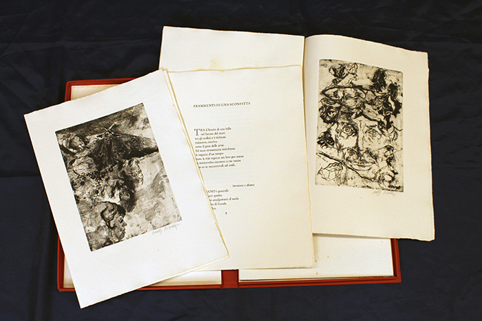 SERENI E PIACESI, "I Poeti illustrati", 1970, editiones dominicae, cofanetto rosso con all'interno poesie di Vittorio sereni ornate di 3 acqueforti di Walter Piacesi sono state composte e stampate a mano da Franco Riva che, per sè e gli amici, grazie a Mondadori, ne ha tirato e numerato in torchio 150 esemplare. Esemplare 3/150, editato a Verona nel Capodanno del 1970, le misure del cofanetto 40x30 cm, le misure delle acquforti sono 37x27. Opera con certificato di provenienza della Daliano Ribani Arte. Opera senza cornice. Il lotto presenta leggerissimi segni del tempo.