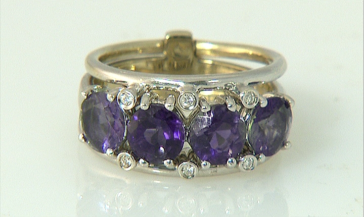 ANELLO. In oro bianco 18 kt al centro motivo a quattro ametiste taglio rotondo disposte a rivière per tot. cts. 2,80 ca. con piccoli diamanti taglio brillante su settori mobili.