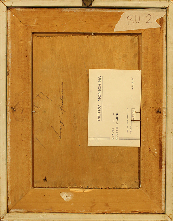 LUIGI MANTOVANI, "Veduta di città", anni '40, olio su tela intavolata, cm 23x16, con cornice 33,5x26,5x4 cm, peso 1 kg. Al fronte: firma in basso a sinistra ed etichetta in basso al centro. Al verso: firma trasversale. Opera con certificato di provenienza della Daliano Ribani Arte. Opera con cornice in omaggio.