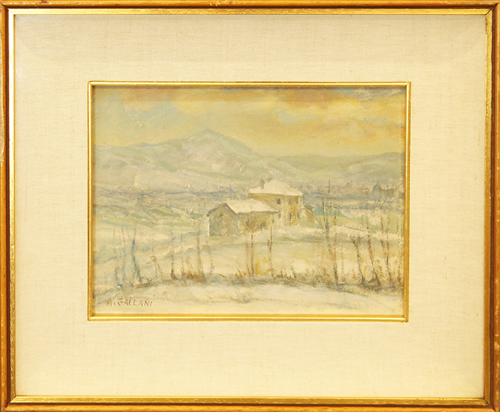 A. GALLANI, "Paesaggio", anni '70, olio su cartoncino, cm 22x29, con cornice 38x45x5,5 cm, 1 kg. Al fronte: firma in basso a sinistra. Al verso: firma e titolo. Opera con certificato di provenienza della Daliano Ribani Arte. Opera con cornice in omaggio.
