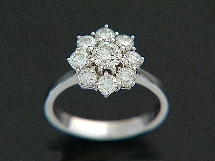 ANELLO. In oro bianco 18 kt a fiore con al centro diamante taglio brillante di cts. 0,45 ca. entro giro in diamanti taglio brillante per tot. cts. 1,20 ca.