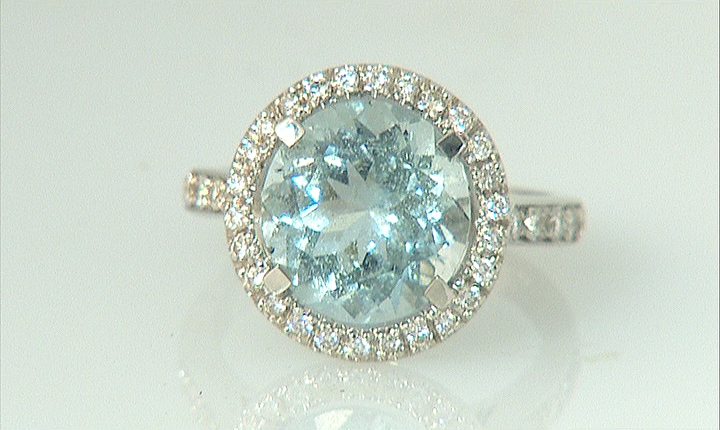 ANELLO. In oro bianco 18 kt con acquamarina taglio rotondo di cts. 9,30 ca. entro cornice in diamanti taglio brillante per tot. cts. 0,90 ca. disposti anche sul gambo.