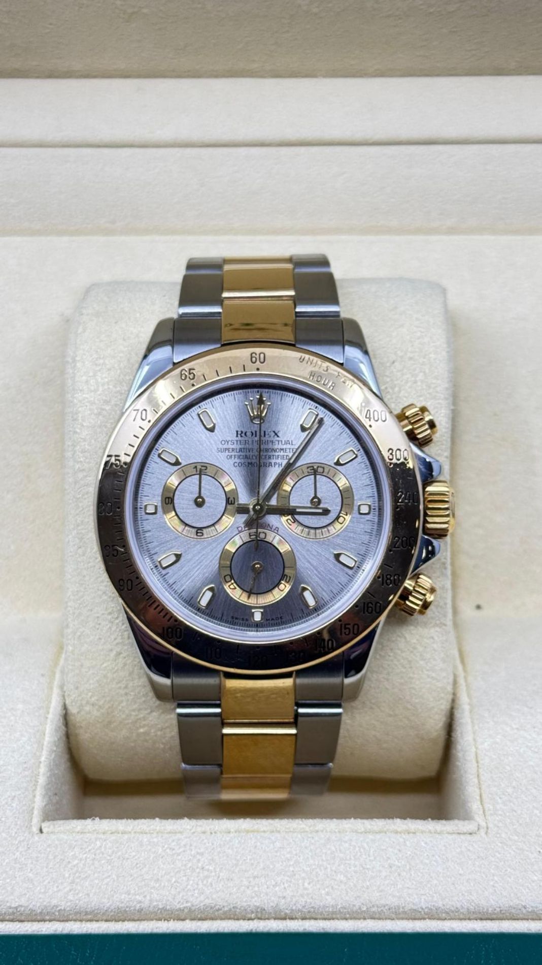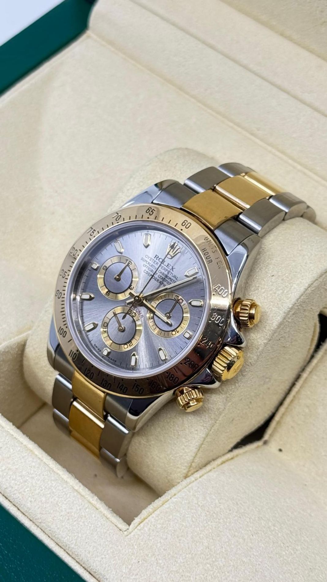 Marca Rolex Modello (Orologio) Daytona Numero di referenza 116523 Carica Automatico Materiale della cassa Oro/Acciaio Materiale cinturino Oro/acciaio Anno 2005 documenti originali Rolex, no box, la scatola viene utilizzata solo per fotografie non è in vendita Calibro Carica Automatico Cassa Materiale della cassa Oro/Acciaio Diametro 40 mm Impermeabile 10 ATM Materiale lunetta Oro giallo Vetro Vetro zaffiro Cinturino Materiale cinturino Oro/acciaio Colore cinturino Oro/acciaio Chiusura Déployante Materiale chiusura Oro/Acciaio Funzioni Cronografo - COMMISSIONE D’ASTA 25%