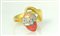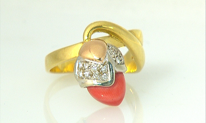 ANELLO DI DAMIANI. In oro giallo, rosa e bianco 18 kt, montatura a bocciolo di rosa con inserto in corallo e decoro in diamanti taglio brillante per tot. cts. 0,15 ca.