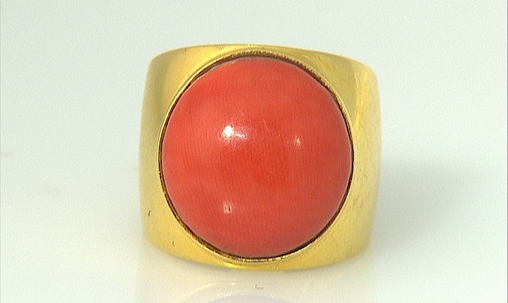 ANELLO. In oro giallo 18 kt a fascia con al centro inserto in corallo taglio rotondo cabochon.