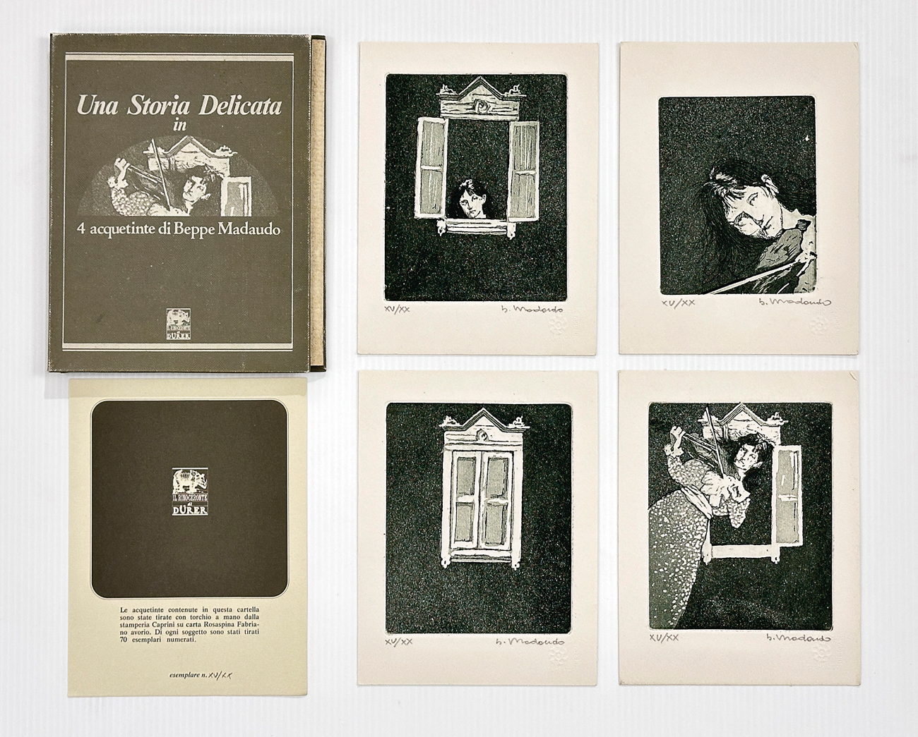 Cartella contenente 4 acquetinte di Giuseppe Madaudo, ciascuna recante firma e numerazione (Esemplari XV/XX) a matita al fronte e timbro a secco dello Stampatore