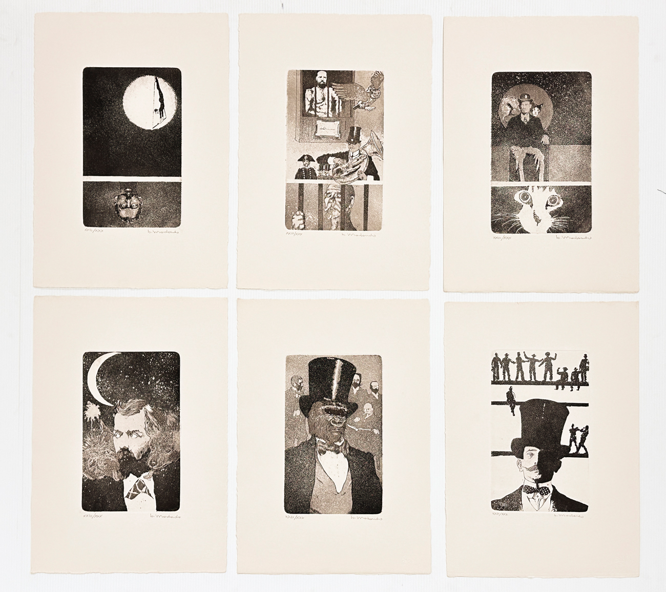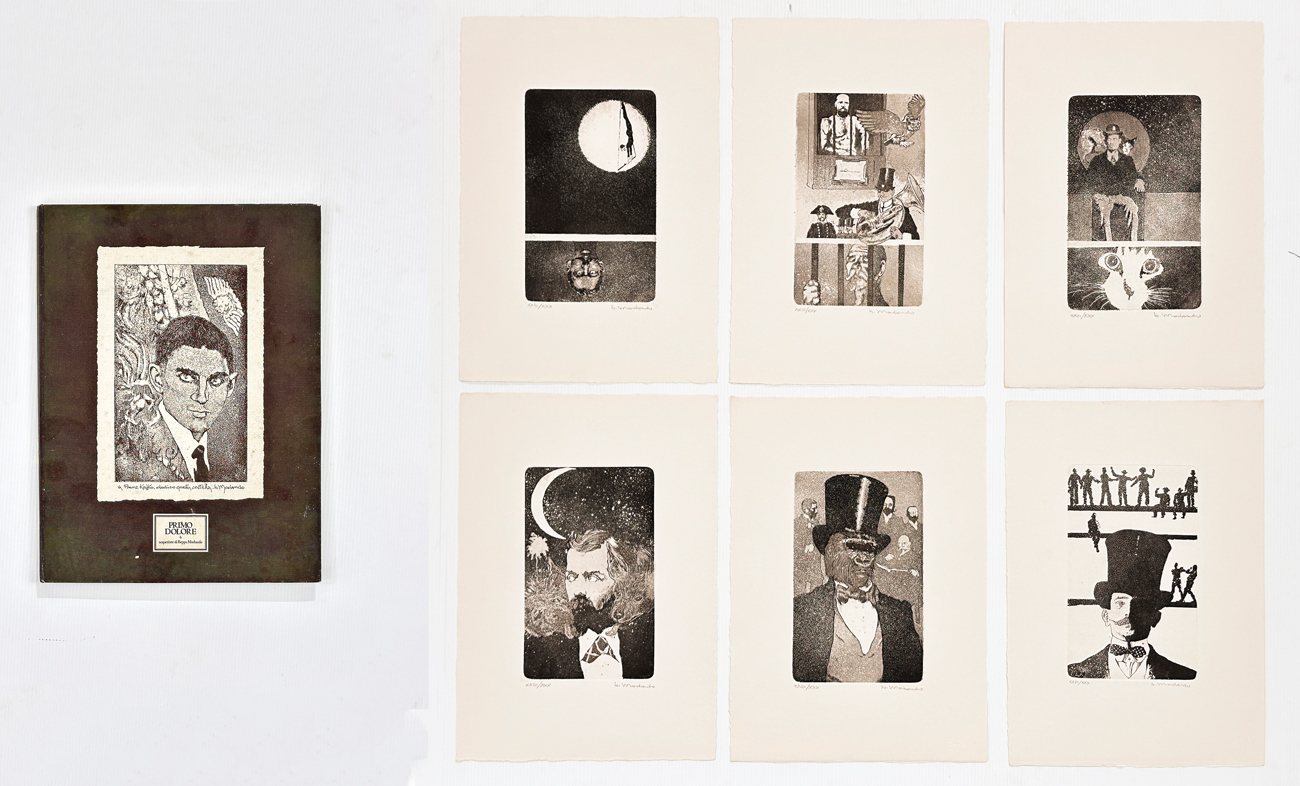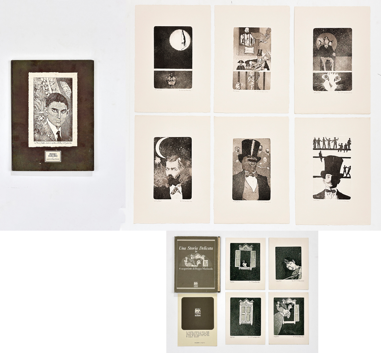 Cartella contenente 6 acquetinte di Giuseppe Madaudo, ciascuna recante firma e numerazione (Esemplari XXIII/XXX) a matita al fronte e timbro a secco dello Stampatore