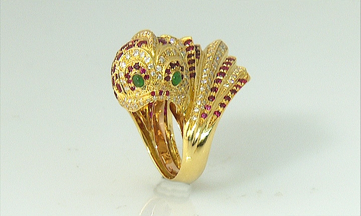 ANELLO. In oro giallo 18 kt internamente foderato, montatura realizzata a pesce con decori in diamanti taglio brillante per tot. cts. 1,30 ca., rubini taglio rotondo per tot. cts. 7,30 ca. e smeraldi taglio rotondo cabochon agli occhi per tot. cts. 0,10 ca.