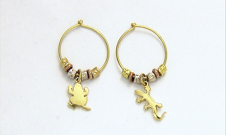 COPPIA DI ORECCHINI. In oro giallo 18 kt perno e clip, realizzati a cerchi con piccoli inserti martellati scorrevoli in argento ed oro e pendenti raffiguranti ranocchia e lucertola (collezione "Dodo" Pomellato).