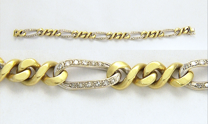 BRACCIALE. In oro giallo e bianco 18 kt maglia groumette alternata a settori ovali decorati da diamanti taglio huit-huit per tot. cts. 0,60 ca.