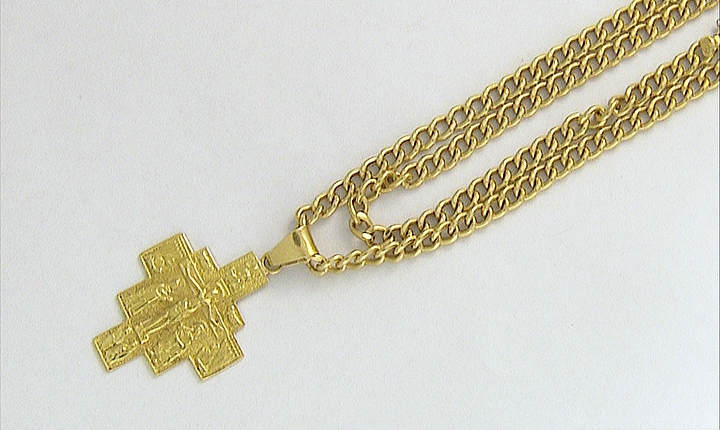 COLLANA. In oro giallo 18 kt a maglia groumette con al centro motivo a croce incisa da ambo i lati.