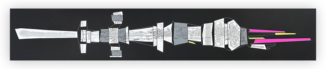 Serigrafia con collage composta da due fogli pieghevoli in cartoncino nero