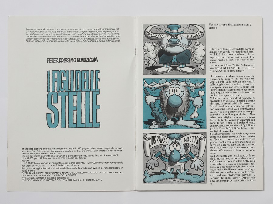 JACOVITTI E MARCHESI KAMAS ULTRA vol 4 edizione del 1977. 1977. Stampa a colori. Cm 24,00 x 34,00. Ecco il grande maestro che si lancia in una parodia del Kamasutra, delle cui "posizioni" Jacovitti proponeva delle ironiche, assurde e surrealissime interpretazioni. Quando fu pubblicato per la prima volta, il libro suscitò delle controversie, tanto per il contenuto quanto per l'immagine che Jacovitti si portava dietro di autore per famiglie. Numerosissime illustrazioni e panoramiche del tutto inedite per la Maga Publicitas di 28 pagine ciascuna.