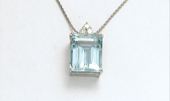 CIONDOLO. In oro bianco 18 kt centrato da acquamarina taglio rettangolare a contorno ottagonale di cts. 11,00 ca., motivo superiore a tre diamanti taglio brillante per tot. cts. 0,30 ca., trattenuto da fine catenina in oro bianco 18 kt.
