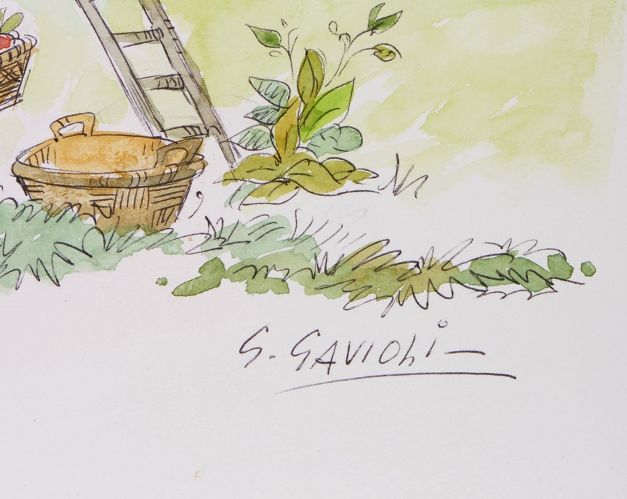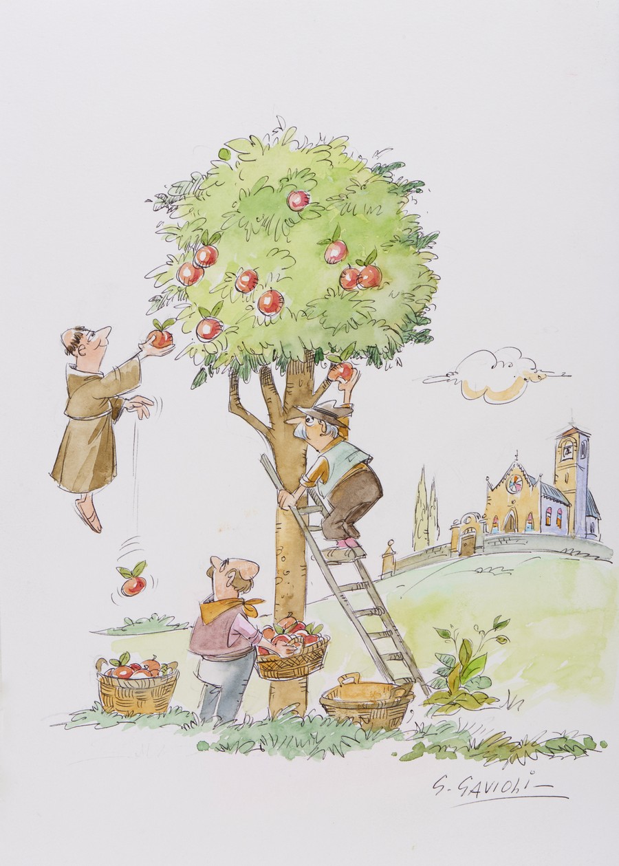 GAVIOLI GIno (1923 - 2016) Illustrazione umoristica dalla Gamma Film a Carosello. 2011. china colorata su carta. Cm 21,00 x 31,00. firma in basso a destra