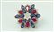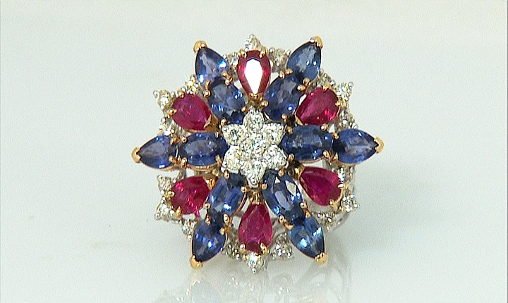 ANELLO. In oro bianco 18 kt montatura traforata a ragnatela con sommità a grande fiore impreziosito da zaffiri taglio goccia per tot. cts. 6,40 ca., rubini taglio goccia per tot. cts. 3,40 ca. e diamanti taglio brillante per tot. cts. 1,00 ca.
