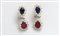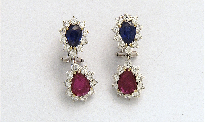 COPPIA DI ORECCHINI PENDENTI. In oro bianco 18 kt perno e clip con rubini e zaffiri taglio goccia per tot. cts. 4,60 ca. entro cornici in diamanti taglio brillante per tot. cts. 1,90 ca.
