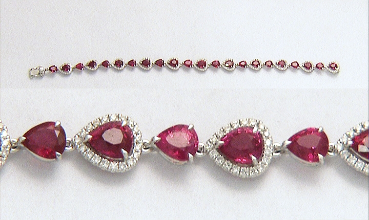 BRACCIALE. In oro bianco 18 kt con rubini taglio goccia per tot. cts. 9,94 (caratura incisa) e diamanti taglio brillante per tot. cts. 1,00 ca.