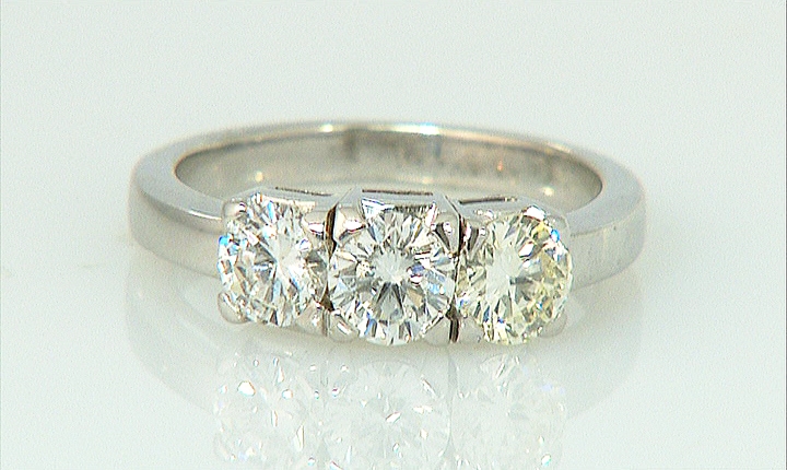 ANELLO TRILOGY. In oro bianco 18 kt con tre diamanti taglio brillante per tot. cts. 1,70 ca. entro castoni quadrati a quattro griffes.