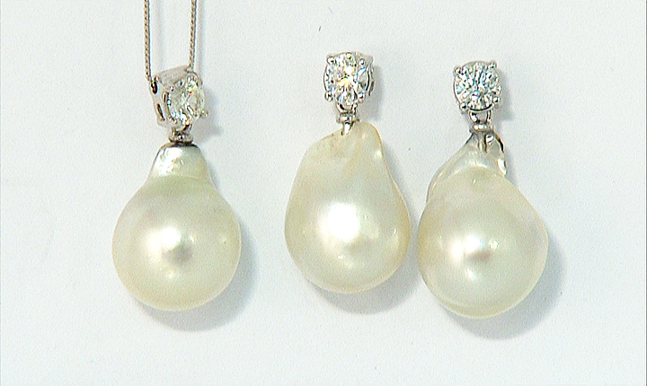 DEMI PARURE. In oro bianco 18 kt composta da coppia di orecchini perno e farfalla e ciondolo trattenuto da catenina, diamanti taglio brillante per tot. cts. 0,80 ca. e perle coltivate barocche.