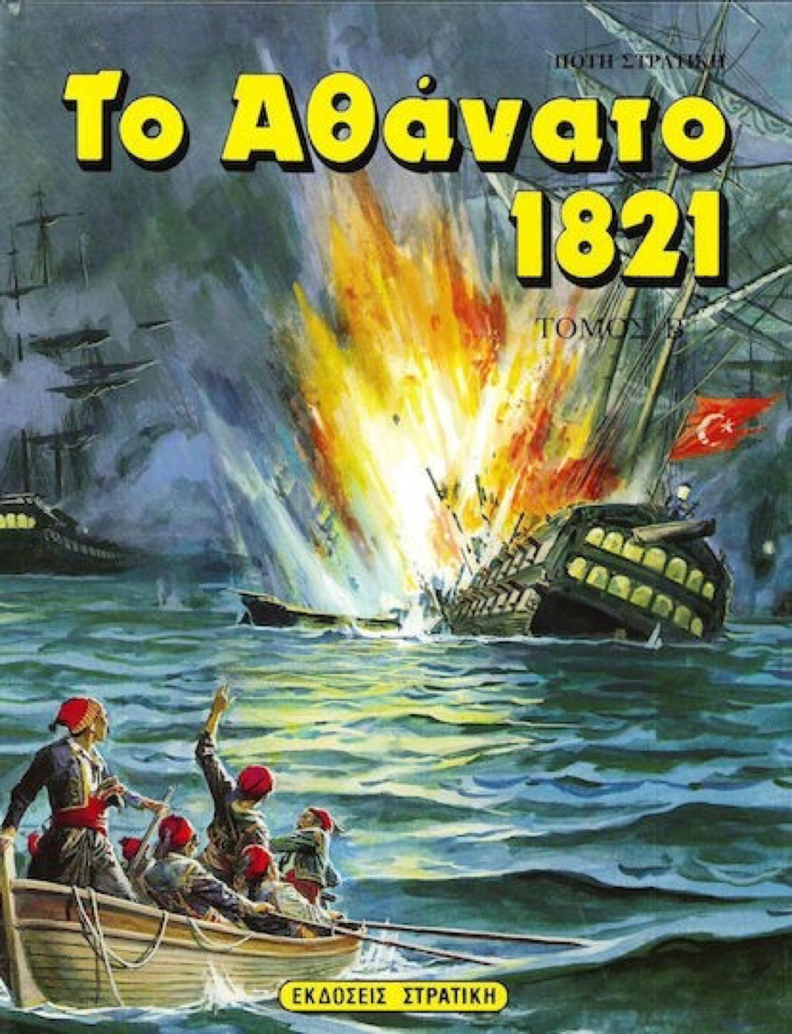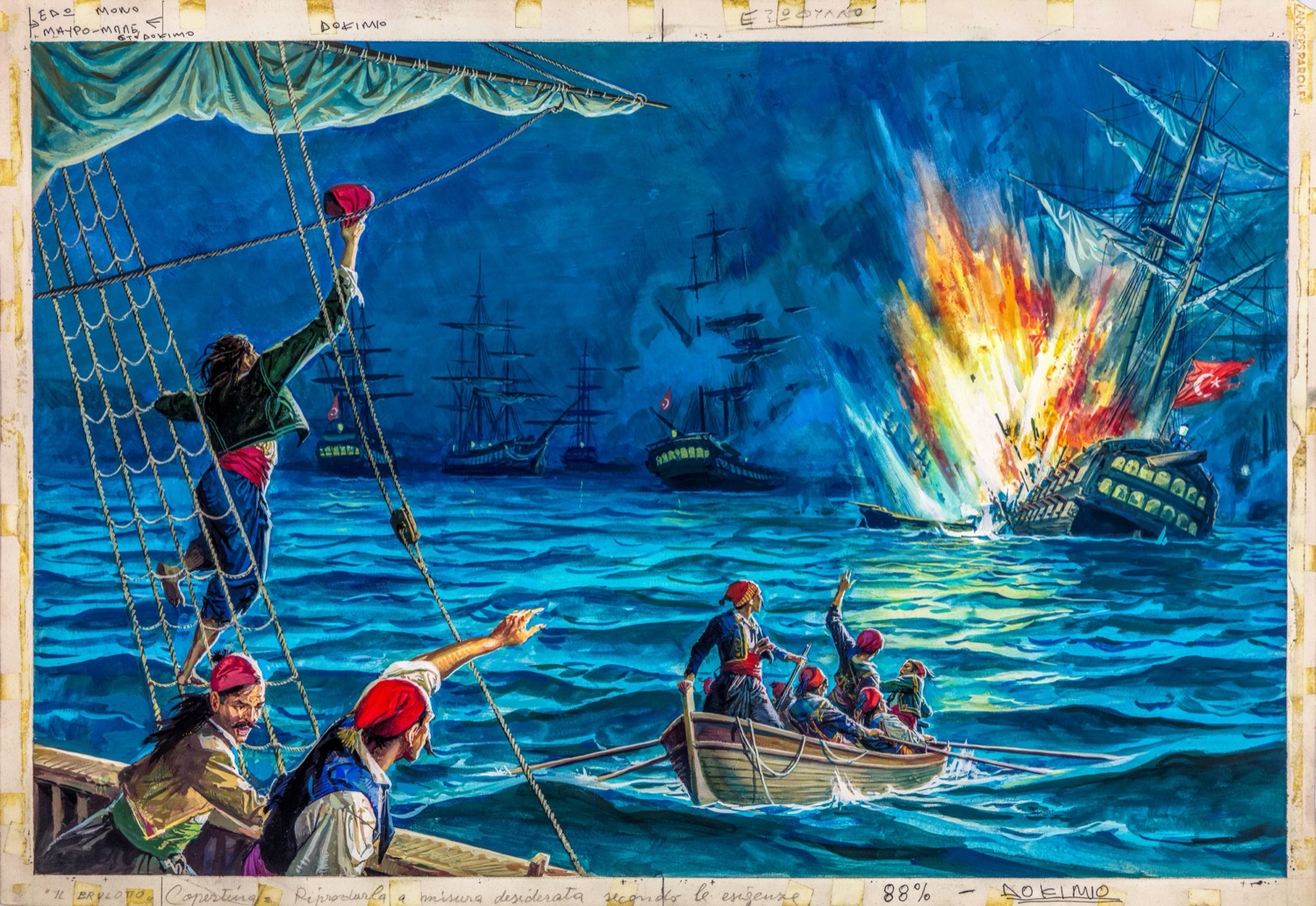 Originale di copertina (e quarta di copertina) realizzato da Baraldi per il volume "L'immortale 1821", edito in Grecia dell'editore Stratikis nel 1990. Lieve ondulature dei margini, piccolo strappo al margine inferiore.