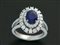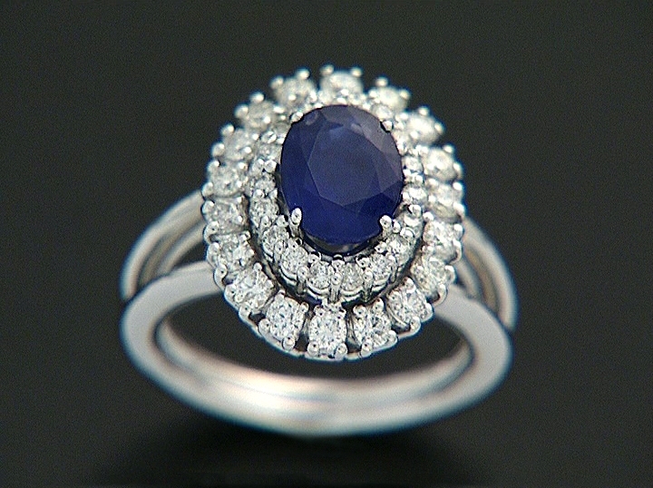 ANELLO. In oro bianco 18 kt centrato da zaffiro taglio ovale di cts. 2,70 ca. entro doppio giro di diamanti taglio brillante per tot. cts. 1,50 ca.