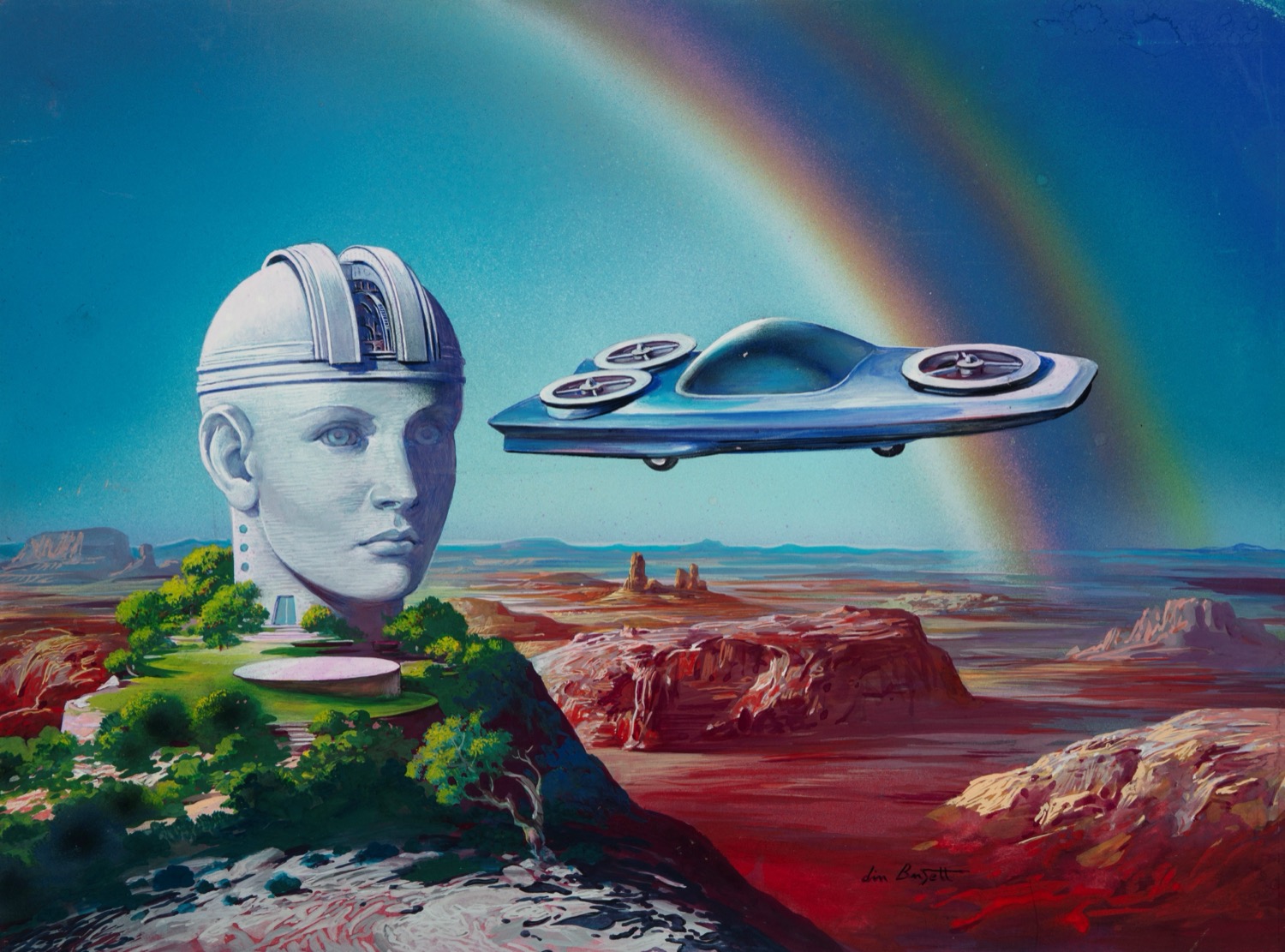 Illustrazione originale realizzata da Busett per la Grande Enciclopedia della Fantascienza, edita dall‘Editoriale Del Drago nel 1980-81. Al retro: "Arizona - Valle dei monumenti - Osservatorio in stile anatomico con macchina volante. " Lieve piega all'angolo superiore sinistro. Firmato.
