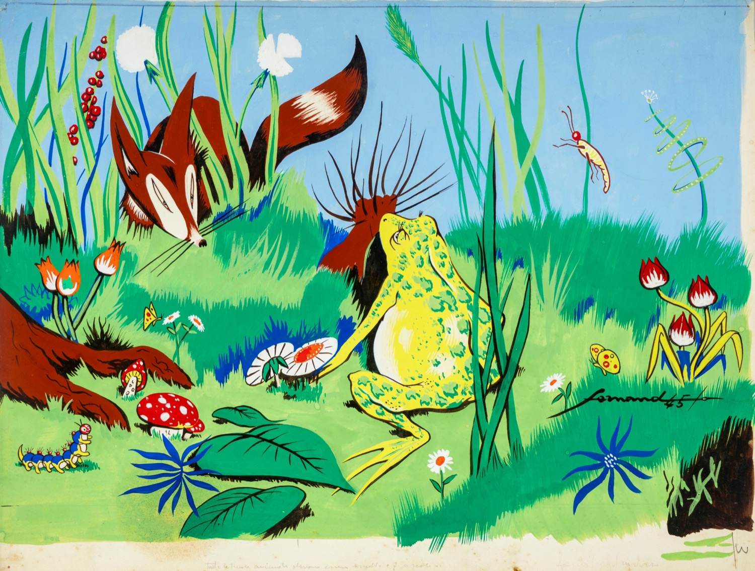 Lotto composto dall'originale di copertina e da 3 illustrazioni originali realizzate da Fernando per il volume "Le Favole di Esopo in versi", edito da Franceschini nel 1948. Firmate e datate.