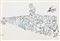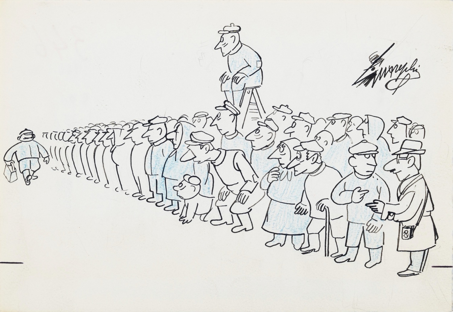 Illustrazione originale realizzata da Guareschi e pubblicata sulle pagine del quotidiano La Notte il 14 ottobre 1964. "Chi è? Uno dei tre astronauti del Voskod? / No, è il compagno Cikof, in sole sette ore di coda, è riuscito a conquistare due chili di patate, tre carote, un etto di lardo e 75 grammi dii burro. " Firmata al fronte e datata al retro.